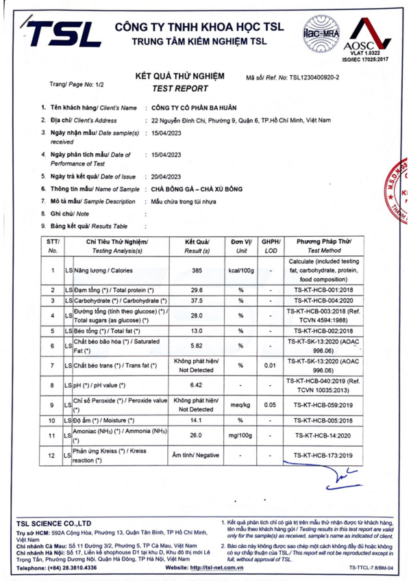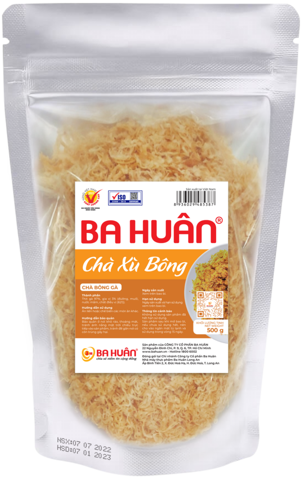 Chà xù bông (chà bông xù) được chế biến từ nguồn thịt gà chất lượng cao, chọn lựa kỹ càng từ trang trại Ba Huân, áp dụng công nghệ hiện đại và đạt tiêu chuẩn an toàn vệ sinh thực phẩm.