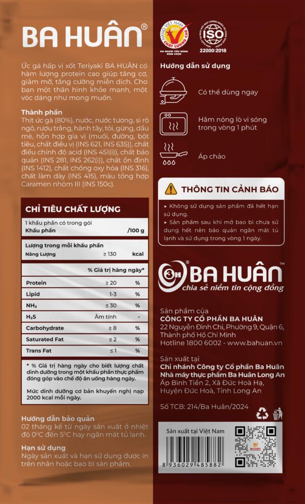 Ức gà ăn liền Ba Huân được làm từ giống gà tơ nhập khẩu cao cấp, mang đến hương vị thịt tươi ngon, ngọt nước, và mềm mịn tự nhiên. Với quy trình kiểm soát nghiêm ngặt từ nguồn thức ăn, Ba Huân đảm bảo ức gà giữ được độ ẩm hoàn hảo, không khô mà vẫn đậm vị, thơm ngon trong từng thớ thịt.