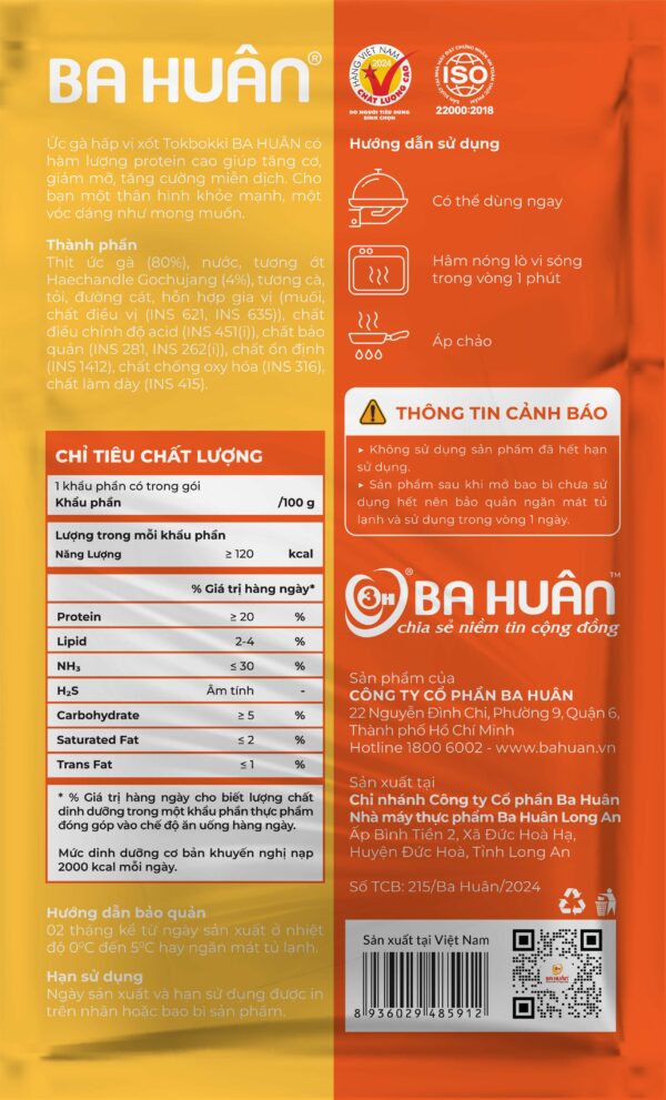 Ức gà ăn liền Ba Huân được làm từ giống gà tơ nhập khẩu cao cấp, mang đến hương vị thịt tươi ngon, ngọt nước, và mềm mịn tự nhiên. Với quy trình kiểm soát nghiêm ngặt từ nguồn thức ăn, Ba Huân đảm bảo ức gà giữ được độ ẩm hoàn hảo, không khô mà vẫn đậm vị, thơm ngon trong từng thớ thịt.
