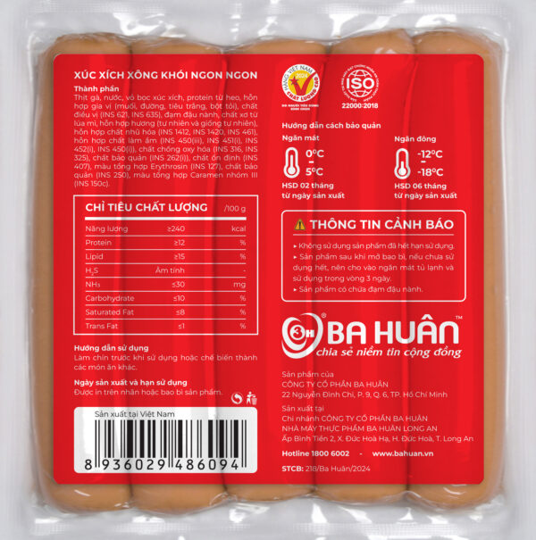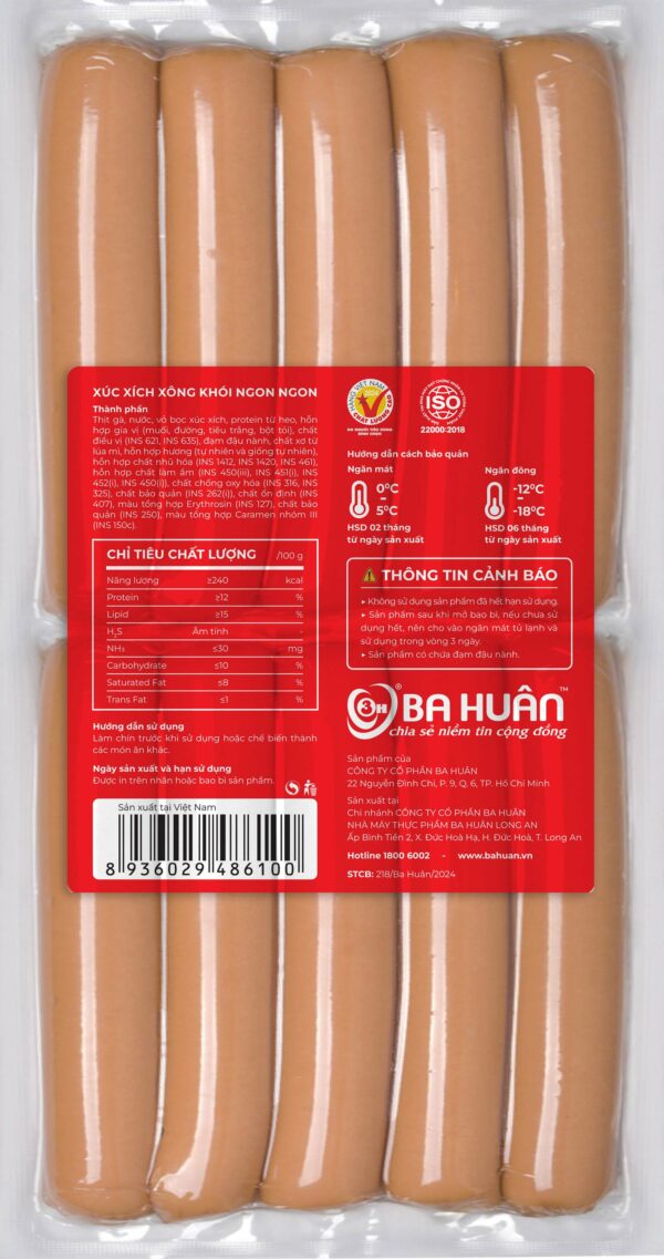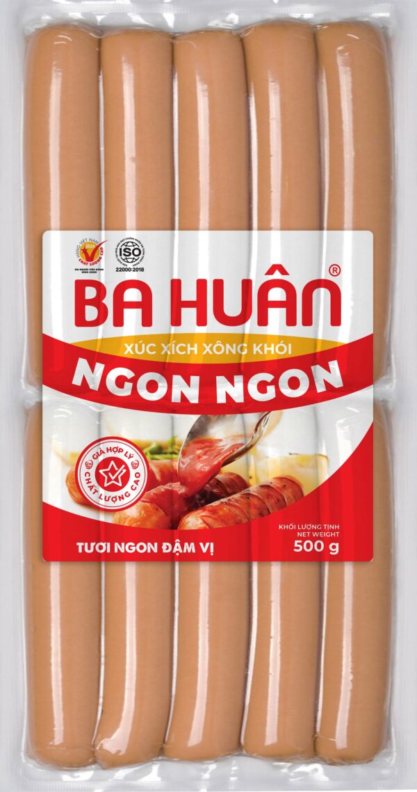 Xúc xích Xông khói của Ba Huân sản xuất từ hệ thống được kiểm soát chặt chẽ theo nguyên tắc chuỗi khép kín “Thức ăn chăn nuôi – Trang trại chăn nuôi – Nhà máy chế biến thực phẩm” (Feed-Farm-Food) nhằm mang lại giá trị dinh dưỡng cao nhất và vệ sinh an toàn thực phẩm đến người tiêu dùng. Xúc xích được xông khói bằng gỗ sồi nhập khẩu từ châu u, đem lại hương vị thơm ngon chuẩn vị.